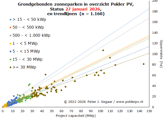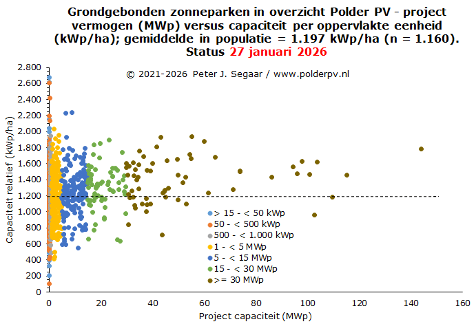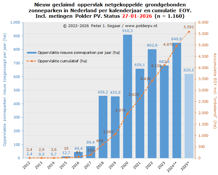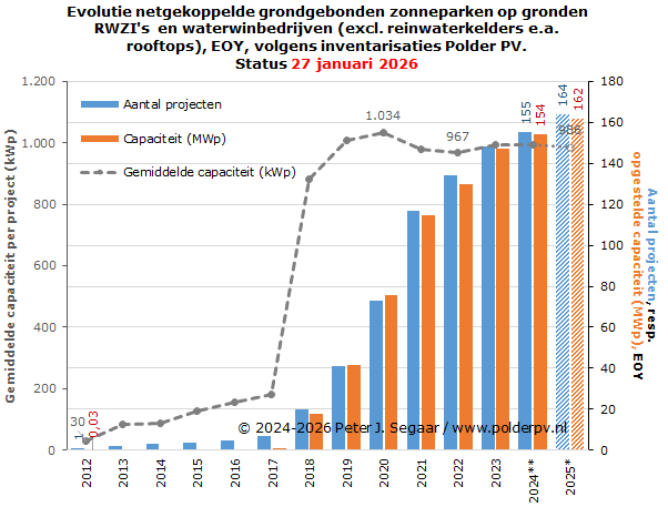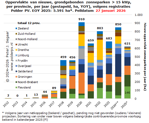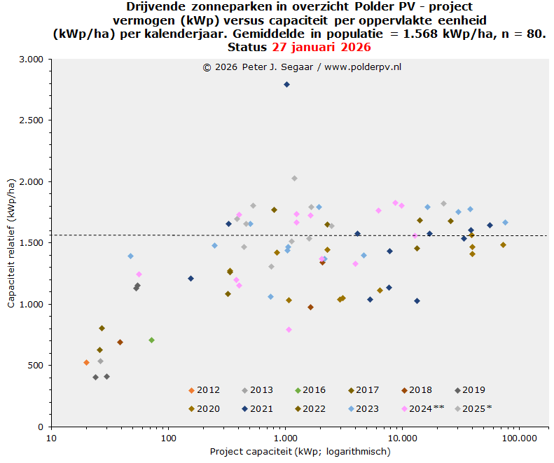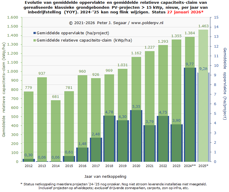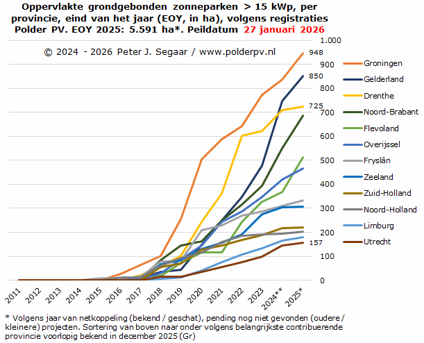 Ik heb de huidige status uit mijn projecten overzicht voor grondgebonden zonneparken gebruikt om voor die peildatum (medio januari 2026) ook een vergelijking te kunnen doen met de nationale totaal cijfers, tot en met kalenderjaar 2024. Het kan beslist nog zo zijn dat de cumulatie voor de capaciteit van grondgebonden zonneparken in de projectsheets van Polder PV nog enigszins kan wijzigen voor met name de recentere jaren, resulterend in een later bij te stellen relatief aandeel percentage in de laatste kolom. De verwachting is dat deze bijstellingen vrij gering zullen zijn / worden.
