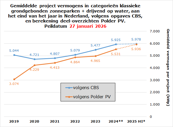 (d) Holland Solar schatte in de EU Market Outlook for Solar Power 2025-2030, gepubliceerd op 11 december 2025, voor de Europese branche organisatie SPE, voor 2024 grofweg 1,3 GWp nieuwbouw af voor het "utility scale" (projecten >= 1 MWp) segment, bij een totaal marktvolume van zo'n 3,4 GWp. Het totale jaarvolume is hier wat hoger dan de 3.267 MWp volgens het CBS, maar bekend is dat dergelijke cijfers later nog flink kunnen worden bijgesteld (meestal: opwaarts). Polder PV heeft voor de projecten groter of gelijk aan 1 MWp al bijna 1,5 GWp staan voor dat jaar, wat al duidelijk hoger is, zo'n 15%. Bovendien zullen er waarschijnlijk nog projecten aan worden toegevoegd, die later pas bekend zullen worden. Van genoemde 1,5 GWp grote nieuwe projecten opgeleverd in 2024 bestaat het overgrote merendeel, bijna 1,2 GWp, uit nieuwe grondgebonden + drijvende projecten, in de actuele bestanden van Polder PV. In de officiële cijfers van het CBS staat voor 2024 echter nog maar een nieuw jaarvolume van 902 MWp benoemd in de laatste update daar. De verwachting is, dat dat nog flink zal worden bijgesteld, op basis van de recente, zeer actuele cijfers van Polder PV.