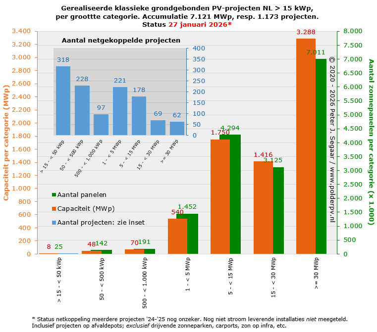 Tot slot, werd de 7,0 GWp voorbijgestreefd toen in de update van RVO van 1 januari 2026 het formele "ja-vinkje" werd getoond voor de uit drie separate delen bestaande Zonneweide Larendeel, gebouwd door Chint Solar (oorspronkelijk ge-entameerd door Green Trust Projects), in Afferden (Druten, Gld). Het project blijkt al in 2025 te zijn opgeleverd, dus die toevoeging was, zoals heel vaak in dit soort gevallen, feitelijk een exemplaar "met terugwerkende kracht". De soms enorme vertragingen in de officiële rapportages zijn de oorzaak hiervan.
