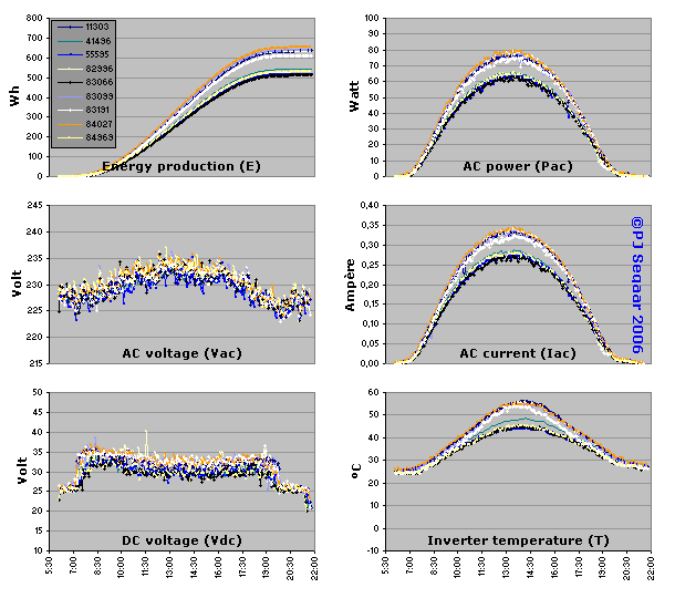 Het verloop van alle 6 van de individuele inverters gemeten systeemvariabelen (E, Pac, Vac, Iac, Vdc resp. T) wordt in het volgende overzicht gegeven (muiswijzer naast overzicht), evenals de gemiddelde data per groep AC modules (muiswijzer boven overzicht). Bij beide grafieken zijn de resultaten van de defecte omvormer 82968 niet meegenomen (gemiddelde van de 108 Wp groep is bepaald van de 5 goed functionerende omvormers).