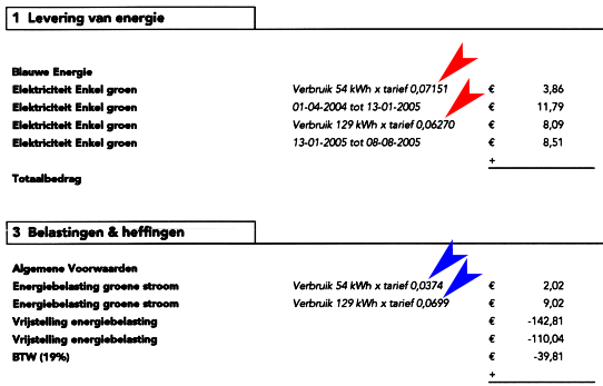 financiële opbrengst Polder PV Daarbij moet wel aangetekend worden dat wij slechts een enkeltarief telwerk bezitten ("continu tarief"), en we geen ingewikkelde berekeningen hoeven te maken met hoog- en laagtarief, waarmee zowel netbeheerders als leveranciers trouwens hun "eigen politiek" blijken te hebben als het om het afrekenen van de gesaldeerde zonnestroom gaat. Hebben wij zelf gelukkig niets mee te maken, dus dat is allemaal een stuk eenvoudiger. Uiteraard zijn de berekeningen bij "vaste contracten" met een vaste kWh prijs over 1,3, 5 jaar etc. nog simpeler, al zitten ook daar mogelijk haken en ogen aan. Dat zijn vaak contracten met een zeer lage kWh prijs, maar hoge verborgen vastrecht- en boete kosten. Zeer ongunstig voor netinvoeders die een forse hoeveelheid zonnestroom op het net zetten die dan voor een "lage marktwaarde" in de boeken terecht komt... Wat de grafieken op deze pagina duidelijk maken, dat je beslist niet "rijk" wordt van zonnepanelen op eigen (huur)woning, maar dat je wel degelijk een flink stuk van je elektriciteitskosten kunt drukken (zeker zuinige huishoudens als het onze). Ons eerste, met destijds 250 gulden per paneel door de gemeente Leiden gesubsidieerde PV module (kosten: ƒ 4.016,50 voor 4 zonnepanelen, neerkomend op € 455,65 per paneel nadat - onbekende - subsidies van het energiebedrijf er van af waren getrokken), hebben we "pas" na ongeveer 3 jaar en 7 maanden terugverdiend. Dus we zullen het PV-systeem nog een lange tijd in optimum conditie moeten houden willen we ooit het door ons geïnvesteerde bedrag (onze grootste uitgavenpost ooit, ruim 6.300 gulden of bijna 2.900 Euro voor in totaal 12 modules) "terugverdienen". Let op dat in mijn kWh berekeningen ook nooit "vaste posten" zoals "meetdienst", de diverse andere "vastrecht" posten van zowel de netbeheerder als die van de leverancier (zowel bij NUON Energie als bij Greenchoice voor elektra momenteel 1,99 Euro incl. BTW/maand bedragend) meeneem, zoals dat door anderen vaak onterecht wel wordt gedaan. Met zonnestroom productie heb je namelijk nul en generlei "invloed" op die altijd te betalen vastrecht posten (die moet je sowieso betalen, zelfs al zuip je 9.999 kWh elektra per jaar en wek je helemaal niets zelf op). Vandaar dat Polder PV uitsluitend met alleen kWh-gerelateerde bedragen werkt in zijn berekeningen. Uiteraard geldt hetzelfde voor niets met de kWh kosten van doen hebbende posten als de in 2007 afgeschafte "MEP heffing", noch van de vaste post teruggave energiebelasting (in 2009 318,62 ex BTW/379,16 incl. BTW bedragend) die elk huishouden achter een "aansluiting met woonfunctie" terugkrijgt van het Ministerie van Financiën. Al die onzin moet verre van "de marktwaarde van zonnestroom invoeding" gehouden worden, omdat die posten er niets mee te maken hebben en geen enkele invloed. Ook heb ik verder niet enkele kleinere posten meegerekend (totaal enkele tientjes in de loop der jaren) die voor onze specifieke situatie van toepassing waren of die als "extra" waren te beschouwen. Ballasttegels waren niet ruim genoeg voorhanden hier voor het platte dak, dus die heb ik deels voor een "zacht prijsje" bij de gemeentewerkplaats gehaald met de fietskar (2 tegels van 20 kg./stuk per keer...). Ook de ten bate van de systeemrenovaties gemaakte (geringe) extra kosten zijn verder niet meegerekend: als we een "fault-proof" systeem hadden gehad, zoals in Duitsland vrijwel standaard worden opgeleverd, hadden we die kosten helemaal niet hoeven maken (het betreft o.a. verzendkosten van defecte OK4 omvormers naar N.K.F., dozen voor aansluiting van dikke, voor de niet geplande renovatie benodigde meeraderige DC-kabels op het dak). Extra kWh meters (enkele draaischijfmeters) voor de productie per deelsysteem kostten 11,39 Euro/stuk. Echter, inclusief in de (eerste) systeemprijs zat al het betaalde OK485 data interface, waarvan de gegevens gebruikt worden voor het "voeden" van de daadwerkelijke spreadsheets (ook de "financiële"). Dus die "leuke extra'tjes" die niet persé nodig zijn/waren laat ik hier verder buiten beschouwing. Ik reken verder uiteraard ook niet de monumentale hoeveelheden tijd die ik heb moeten spenderen om de ellende met de OK4 omvormers aan de kaak te stellen, zelf defecte exemplaren op de eigen systemen uit te (laten) wisselen, en met een groep mensen en organisaties de systeemleveranciers onder druk te zetten om een structurele oplossing aan te bieden aan de duizenden getroffen klanten uit het begin van deze eeuw (hetgeen uiteindelijk is gelukt na maanden hard werken). Ook heb ik in de gegevens geen typische economenverzinsels als "inflatiecorrecties" e.d. toegepast, die interesseren me helemaal niet, want dat is gejojo met cijfertjes die er niet echt toe doen en die bovendien volkomen kunstmatig zijn (zoals de meeste geldzaken). Maakt verder niet uit. De milieuwinst is nu al gigantisch, anno juli 2009 al opgelopen tot 8 MWh vermeden fossiel gegenereerde opwek. Neerkomend op dik 4 en een half duizend kg. (4,53 ton) vermeden CO2 uitstoot. En dat komt niet alleen ons huishouden, maar ons allen ten goede. Zonne-energie van eigen huis: een briljante uitvinding! Basis van de berekeningen - praktijkvoorbeeld met variabel transporttarief (tm. 31-12-2008) Het betreft hier een zogenaamde "gesplitste nota" toen ik nog bij Echte Energie zat als (zelf verkozen) leverancier en Continuon als (onverkiesbare) monopolist-netbeheerder de netkosten nog factureerde via het Customer Care Center van de NUON holding (het slecht begrepen zogenaamde "netbeheerdersmodel van facturatie"). Continuon heet in 2009 Alliander en is losgeweekt ("afgesplitst") van de NUON holding (die verder door de Zweedse bruinkolenstoker- en atoomboer Vattenfall zal worden opgeslokt). Per 1 januari 2009 zijn de variabele transportkosten (incl. systeemdienst TenneT) vervallen en zijn die vervangen door een nooit meer door de zuinige afnemer resp. decentrale opwekker te beïnvloeden krankzinnig capaciteitstarief (superslinks buitenwettel