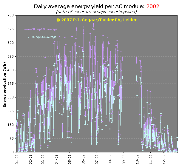 van deze 108 Wp AC modules in dezelfde grafiek opgenomen (paars). Door
