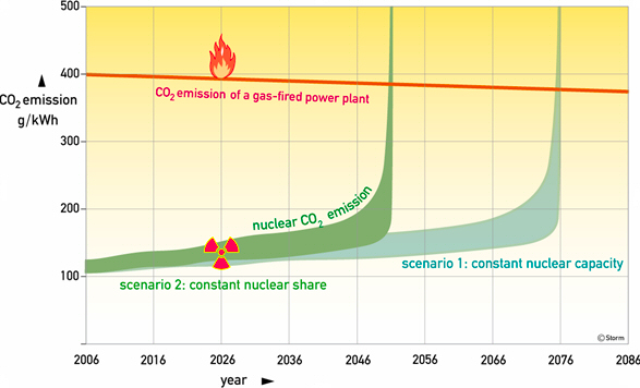 (klik op plaatje voor uitvergroting) >>> Figuur 6. De CO2-val, of: een andere hockeystick. Door het toenemend energieverbruik van de uraniumwinning zal de specifieke CO2 emissie stijgen in de loop van de tijd. Binnen de levensduur van nieuw te bouwen kerncentrales zal de CO2 emissie hoger worden dan van fossiel opgewekte elektriciteit: kernenergie loopt dan in de CO2-val. De groene banden geven de spreiding in de uitkomsten aan, door onzekerheden in de invoergegevens. |
