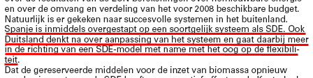 Ik moet op mijn vullingen gaan passen, maar wat hier op het Heilige Tweede Kamer Papier gedrukt staat, is een fenomenale LEUGEN! HOEZO, Duitsland wat een "SDE-model" gaat aannemen? Hoe KOMT van der Hoeven bij die rabiate kolder? Duitsland is totaal onvergelijkbaar met Nederland, beste mevrouw van der Hoeven! Dat had de beste wetgeving ter stimulering van duurzame elektriciteit reeds in het jaar 2000 geïmplementeerd, jááááren voordat ene mevrouw van der Hoeven de meest onzinnig CRAP aan de vaste commissie voor Economische Zaken mocht voorleggen! En in 2004 werd dat model nog aggressiever uitgebouwd met nog betere marktprikkels, wat tot gevolg had dat Duitsland alleen al op het vlak van zonnestroom onaangetast wereldkampioen werd (met anno 2007 al mogelijk minimaal 3,8 GigaWattpiek aan het net gekoppeld zonnestroom vermogen). Het door van der Hoeven's bureaucraatjes in elkaar geflanste, door mij zwaar bekritiseerde "SDE-gedrocht" (een karakteristiek rampzalig ambtelijk kruideniers-aftreksel van de ook al verschrikkelijke MEP-regeling) lijkt op cruciale punten in de verste verte niet op het superieure systeem bij de oosterburen, mevrouw van de Hoeven. U kletst uit uw nek en u liegt dat het gedrukt staat. Op een officieel Tweede Kamerstuk...