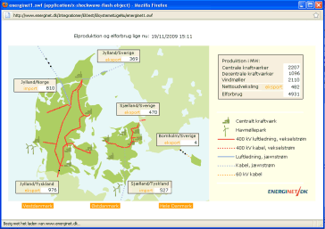 19 november 2009: Importeren, exporteren Dänischer Art. Met dank aan Jaap Langenbach van Wind Service Holland kwam ik op een hele leuke "feature" van de Engelstalige Deense website van de landelijke hoogspanningsnetbeheerder Energinet.dk. U vind die optie op de hieronder gelinkte pagina. Rechtsbovenaan ziet u een kaartje van Denemarken met daarboven de titel "The electricity grid just now". Als je op dat kaartje klikt opent een nieuw venster, en dan is het feest (als u tenminste geen problemen met flash/"shockwave" players o.i.d. krijgt zoals Jaap meldde, bij Polder PV startte de boel gelukkig probleemloos). Het venster wat u voorgeschoteld krijgt ziet er zo uit:
