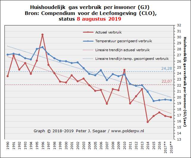 De energiebelasting op gas wordt per 1 januari 2019 in de eerste staffel, de voor alle huishoudens, maar ook voor heel veel fors gas verbruikende "klein" verbruikers, met consumptie tm. 170.000 m³ per jaar, "enige relevante", met wederom ruim 3,3 Eurocent per m³ verhoogd. Daar is de inflatie nog bijgekomen (gerekend wordt er met 1,2% t.o.v. oude tariefstelling 2018). Een toename van nog eens 12,7% t.o.v. de tariefstelling in 2018 resulteert in een EB bedrag van 29,31 Eurocent/m³ ex btw voor 2019 (dat wordt 35,47 Eurocent incl. 21% btw). Gelukkig is gemiddeld genomen het huishoudelijke verbruik weliswaar in de loop van de jaren afgenomen, maar per verbruikte kuub gaat u nog meer aan Vadertje Staat afdragen. Het gemiddelde huishoudelijke verbruik is volgens het CBS van zo'n 1.700 m³/jaar in 2004 gedaald naar nog maar 1.240 m³/jaar in 2017, tussen extremen van 840 - 2.200 m³/jaar, afhankelijk van het type huishouden (analyse).
