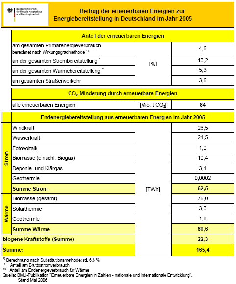 (globale cijfers duurzame energie 2005 Duitsland, figuur hierboven)