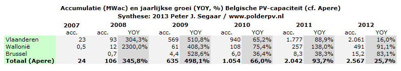 Eindejaars-accumulatie cijfers voor AC vermogen in de drie Belgische deelmarkten en de totale cijfers (bovenaan, vetgedrukt). De Belgische markt is geëxplodeerd naar een totaal volume van bijna 2,6 GW AC capaciteit, vooral door de stormachtige ontwikkelingen in Vlaanderen in verleden jaren. Daar zou eind 2012 volgens Apere 2.061 MWac aan capaciteit staan, dik 2 gigawatt.