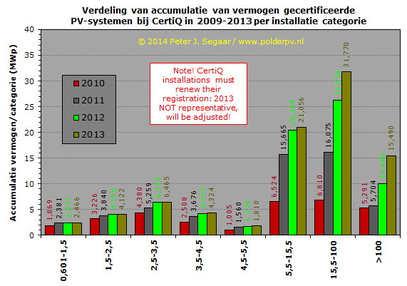 Er is nu 665,5 MWp PV vermogen in het PIR geaccumuleerd ("eindjaar 2013" als vermelding), met een spectaculaire hoeveelheid van al bijna 162.000 installaties. Derhalve is de marktgroei in 2013 - onder voorbehoud van zowel onzekerheden bij PIR, als bij CBS - veel hoger geweest dan, wederom, de sector heeft gedacht. Er zou minimaal 300 MWp bijgekomen kunnen zijn, veel meer dan de (voorlopige) 220 MWp die CBS voor 2012 heeft geschat. En beslist een nieuw record voor Nederland. Wederom: veel hoger dan zelfs specialisten zich hebben laten ontvallen (zat wel in mijn mogelijke groeiscenario's).