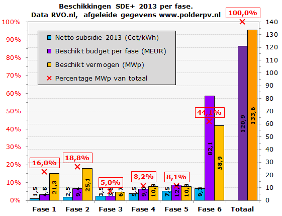 In paars de in de nieuwe RVO tabel weergegeven beschikte hoeveelheid geld (in MEUR) per fase voor PV. In oranje de uit beide voorgaande cijfers berekende per fase toegekende (beschikte) capaciteit, in MWp. Achteraan voor het beschikte budget en het beschikte vermogen de totale volumes in een iets afwijkende kleurstelling. Tot slot in rood (linker Y-as als referentie, de rest rechter Y-as) het procentuele aandeel van het beschikte vermogen per fase t.o.v. het totale beschikte vermogen voor zonnestroom voor deze regeling. Dat telt op tot 133,6 MWp binnen SDE+ 2013. Waarvoor 120,9 miljoen Euro aan uit te geven subsidies in 15 jaar tijd is gereserveerd. 44,1% van dat vermogen is in de laatste fase 6 beschikt, waarvoor dus een netto subsidie van 9,3 Eurocent/kWh kan worden verwacht op basis van een correctiebedrag van 5,5 Eurocent/kWh.