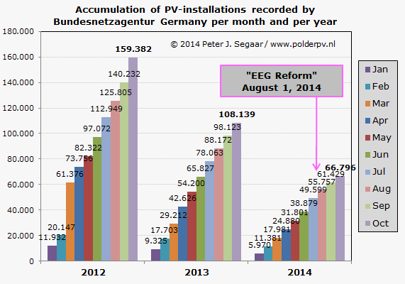 Accumulatie van het vermogen van de nieuwe PV installaties gemeld bij Bundesnetzagentur per maand en per jaar, tot en met september 2014. Zeer onregelmatige en hoge groeicijfers in 2012, fors minder in 2013, en nog eens een substantiële reductie in 2014. Wat begin oktober 2014 eindigde op 1.610 MWp, een factor 3,9 maal zo weinig dan het niveau wat in 2012 was bereikt rond die tijd. En 40% minder dan het niveau in het voorgaande jaar aantikkend. De afname bij het vermogen is dus groter geweest dan bij de aantallen. Dit heeft zoals gezegd alles te maken met de sterk verslechterde condities voor commerciële en zeer grote (vrijeveld) installaties, door de blijvende degressie van de invoedings-tarieven, in combinatie met verplichtingen voor een deel van deze projecten om 10% van de stroom hetzij zelf direct te gebruiken, of deze voor een dump prijs te proberen te verkopen op de stroombeurs (geen Einspeise Vergütung meer voor dat gedeelte). De invoering van het "EEG 2.0" per 1 augustus 2014 heeft die condities alleen maar verder verslechterd.