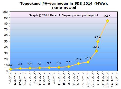 2 december 2014: Stand van zaken SDE 2014 m.b.t. PV. RVO.nl heeft weer een update gedaan van de stand van zaken rond de "felbegeerde" SDE 2014, waarvoor het budget van 3,5 miljard Euro op 4 november al schromelijk was overschreven. Net zoals bij de SDE 2013 was dat nog niet "the end of it". De aanvragen blijven doodleuk binnenkomen, waarschijnlijk van entrepeneurs die wel van een gokje houden*. En die er een paar kaarten (en misschien onder collegae een kratje bier) op hebben gezet dat ze met hun late aanvragen wellicht toch nog een kansje scoren. Voor het - twijfelachtige - geval dat er zoveel eerder binnengekomen aanvragen komen te vervallen en/of worden afgewezen, dat hun exemplaar alsnog in the picture komt.