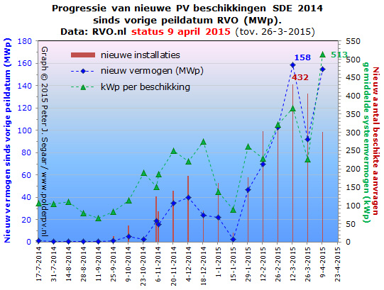 Tot nog toe zijn van de totaal 3.715 aangevraagde PV projecten er 911 beschikt (toename 162 stuks t.o.v. 18 dec. 2014), bijna een kwart van de aanvragen. Het gemiddelde systeemvermogen is bij de aanvragen 363 kWp. Bij de toekenningen (beschikkingen) is het momenteel 188 kWp per aanvraag, fors minder. Dat betekent dat er nog de nodige grote projecten in de pijplijn zitten. Het kan beslist langer duren voordat dergelijke aanvragen zijn verwerkt door RVO. Vermits er niet teveel "ander aangevraagd vermogen" (niet zijnde PV) wordt beschikt, dan wordt de kans dat dergelijke projecten worden toegekend stapsgewijs lager, zeker als ze in dezelfde fase en op dezelfde dag (bijv.: 3 september 2014) zijn binnengekomen.