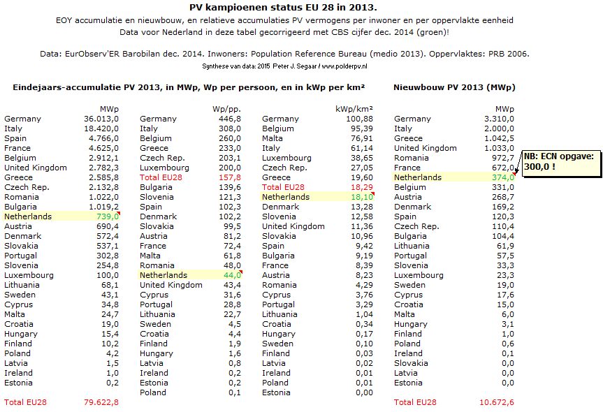 Met de toevoegingen van januari 2015 heeft Duitsland eind van die maand inmiddels al een geaccumuleerd PV vermogen staan met een omvang van 38.359 MWp. Grofweg een factor 32 maal het "mogelijke" volume in Nederland (dat laatste is nog helemaal niet bekend, maar zou ergens in de buurt van 1,1-1,2 GWp kúnnen liggen).