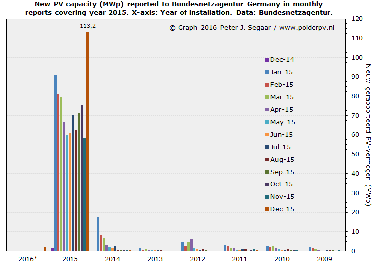 RVO gaat daar nu alweer vet overheen, met hun update van 1 januari 2016. Ze geven al een realisatie van 67,6 MWp op voor die enorme impact hebbende regeling, en dat is een absoluut record (zoals eerder al door mij gesteld) voor enige SDE regeling in de bijna 7-jarige historie van die serie subsidie regelingen. Het is dik 58 MWp meer dan in de voorgaande halfjaar rapportage (van 1 juli 2015). Een spectaculaire 635% meer dan de 9,2 MWp die toen nog voor de SDE 2014 stond genoteerd. Daarbij niet vergeten dat mijn (minimum) inschatting rond Kerst vorig jaar gebaseerd is op nogal gebrekkige informatie uit "de markt", het is fysiek onmogelijk om alle nieuws op internet te volgen, en over veel projecten wordt nooit bericht en die verschijnen dus ook niet op mijn netvlies...