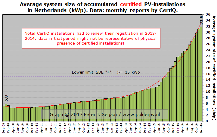 De grafiek toont vanaf de zomer van 2015, gelijk opgaand met de rappe capaciteits-uitbouw van (SDE gesubsidieerde) grote PV projecten, een snelle toename van het geaccumuleerde gemiddelde vermogen per installatie. Dat nam sinds de zomer van 2015 toe van minder dan 12 kWp, naar 21,6 kWp/systeem in het februari 2016 rapport. Goed om te beseffen dat daar nog duizenden zeer kleine (3-5 kWp) residentiële installaties bij zitten. Het gemiddelde wordt zeer sterk omhoog geduwd door de toevoeging van "relatief weinig, maar per stuk zeer grote" PV projecten. Ik zie al langere tijd regelmatig SDE 2014 realisaties langskomen van projecten tussen de 100 en 500 kWp per stuk. Die "stromen in" bij CertiQ, en drukken het geregistreerde systeemgemiddelde rap omhoog. Ik zal in mijn volgende projecten overzicht nader ingaan op de invulling van met name de SDE 2014 realisaties. Het gaat hard.