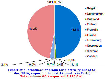 Er werd voor 510 GWh aan GvO's NL uit geëxporteerd, dat is een forse hoeveelheid (equivalent van 42% van de import hoeveelheid). Wat waarschijnlijk aangeeft dat de handelswaarde van die certificaten toeneemt, en dat het kennelijk een interessante hobby is geworden om echt te gaan "handelen" met die papiertjes. Dat zien we al aan het aandeel hydro GvO's, dik 74% van het totaal, die natuurlijk nooit allemaal uit Nederlandse (marginale) waterkracht installaties kunnen komen. Die komen uit landen met grote waterkracht centrales van decennia oud, massaal opgekocht door Nederlandse handelaren. En waarvan de "groenheid" voor een opcentje verkocht wordt aan een willekeurige opkoper, waarbij het geen drol uitmaakt in welk land die woont. Wind was de tweede grootste aandeelhouder bij de export, bijna 24%. Wederom is en blijft byzonder, dat nota bene GvO leveranciers-kampioen Noorwegen, ook weer het grootste volume van door Nederlandse handelaren verpatste GvO's afnam: driekwart van het verhandelde volume! Een trend die ook al goed was te zien in de januari rapportage. "Handel", zo is mij eerder al verzekerd...