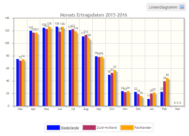 In deze grafiek heb ik zoveel mogelijk "ballast" van eerdere jaren overboord gekieperd, maar de resultaten voor 2015, en het langjarige gemiddelde (zwarte curve) over gehouden. Daarbij de nieuwe resultaten voor januari en februari 2016 in aparte kleur weergegeven. Januari 2016 lag iets boven de output in dezelfde maand in 2015, voor februari lag het resultaat weliswaar boven het langjarige gemiddelde, maar beduidend lager dan de hoge februari productie in het voorgaande jaar.