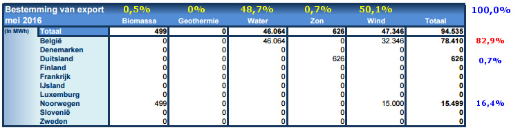 Het totale export volume van GvO's in de afgelopen 12 maanden incl. mei 2016 was iets hoger dan in april, 2,75 TWh. Dat is desondanks maar 7,1% van het in dezelfde periode geïmporteerde volume (38,7 TWh) om onze blijvend smerige gas/kolen gestookte stroomvoorziening te verschaamgroenen. Doordat België in mei wederom het grootste deel van geëxporteerde GvO's (handelswaren) van Nederland opkocht, is het land weer verder uitgelopen op Noorwegen (53,3 versus 44,1%, dat was in de vorige maand rapportage nog 52,0 versus 44,9%). Het blijft hoogst curieus dat Noorwegen het veelvoudige aan virtuele groene papierwaren tegelijkertijd aan de grootste Europese GvO slokop van allemaal blijft leveren: Nederland.