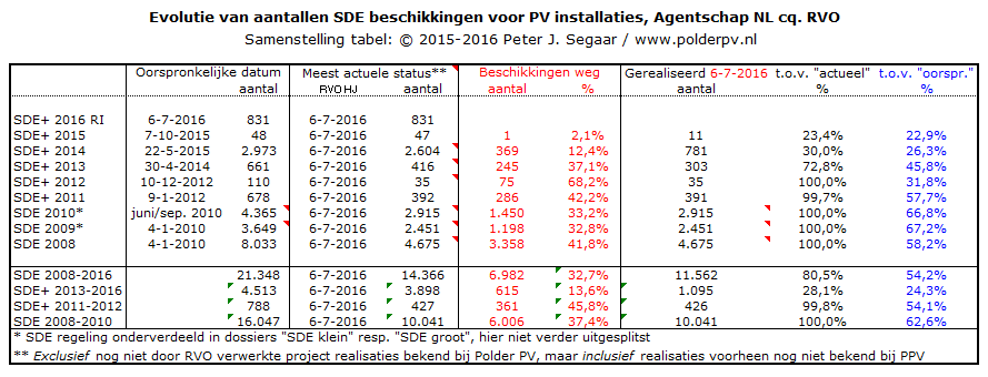 Ik heb op Polder PV al meermalen vergelijkbare tabellen gepubliceerd. Zie voor de voorlaatste versie van 12 mei 2016, gebaseerd op een unieke cijfer update gepubliceerd in de Klimaatmonitor databank van Rijkswaterstaat, hier. In die update heb ik zelfs een unieke segmentatie van SDE beschikkingen en realisaties per provincie weergegeven. Hier onder de laatste stand van zaken voor de algemene landelijke trend. Met de zeker voor de recentere SDE regelingen weer fors aangepaste data die RVO heeft verstrekt voor peildatum 6 juli 2016. Ik heb hierbij ook als gebruikelijk de al lang uit menig hersenpan verdwenen informatie over de, zeer belangrijke, oorspronkelijke volumes beschikkingen vermeld. Want het succes van de SDE regelingen dient eigenlijk niet afgemeten te worden aan "het overgebleven aantal" beschikkingen, zoals RVO hardnekkig - en misleidend - blijft doen. Juist een vergelijking met de in eerste instantie toegekende hoeveelheid dient de belangrijk(st)e maatstaf te zijn. En Polder PV doet dat als enige in Nederland (blauwe cijfers laatste kolom). Eerst de aantallen beschikkingen.