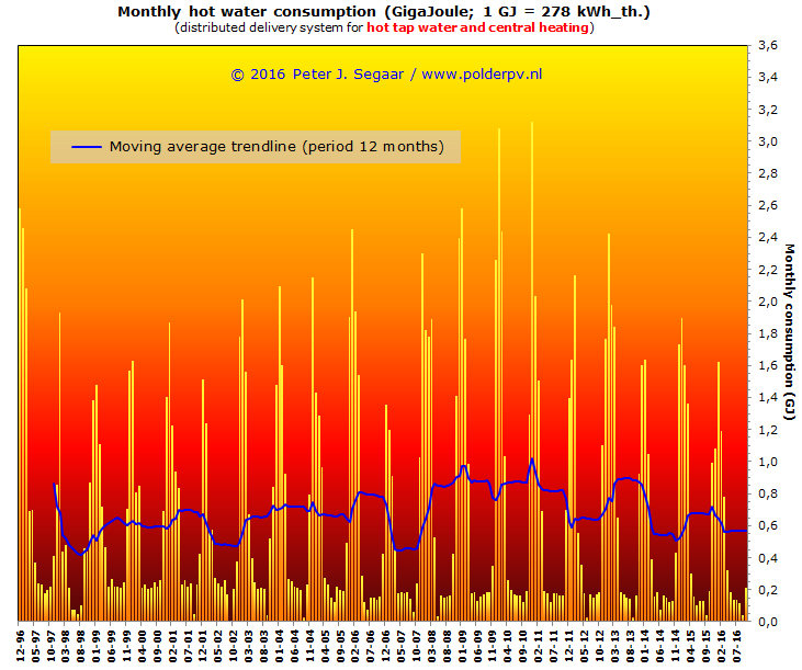 Deze grafiek is enigszins samen te vatten als "Polder PV's contributie aan het verlagen van de druk op Groningen", al moet daar natuurlijk ook weer een relativering bij. Ons kookgas verbruik was sowieso altijd zeer laag, grofweg 2-3,5 kuub per maand, wat natuurlijk in geen enkele verhouding staat tot het gemiddelde gas verbruik in een doorsnee "gas-woning". Zelfs al zijn de CV ketel technieken verder verbeterd, en is het gasverbruik dientengevolge bij de huishoudens continu gedaald, anno 2014 was het gemiddelde verbruik nog steeds volgens het CBS (Statline data) 1.200 m³/jaar, wat neerkomt op ongeveer 100 m³ per maand. M.a.w., het zet slechts zeer beperkt zoden aan de Groningse dijk, zo'n verbruik aan kookgas. Wel had het verruilen van de fluitketel op gas voor de elektrische waterkoker in 2012 bij Polder PV een aanzienlijk effect. We zitten nu nog maar grofweg op minder dan 1,5 m³/maand, op jaarbasis komen we in 2016 volgens mijn prognose nog maar op een ruime 15 m³. Het stelde al weinig voor, en het is nog minder geworden. Maar: alle kleine beetjes helpen om Groningen minder te laten beven.