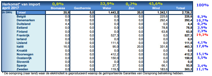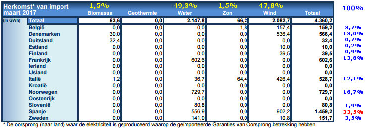 In de afgelopen 12 maanden inclusief maart 2017 werd volgens CertiQ voor een volume van maar liefst 40.639 GWh aan GvO's Nederland in geïmporteerd. Dit, terwijl er in de periode van 12 maanden tm. februari 2017, met nog voorlopige cijfers voorhanden, slechts voor 13.851 GWh fysiek aan eigen opwek (op eigen bodem, inclusief de Noordzee) werd gerealiseerd. Zelfs al moet er nog het nodige volume aan fysieke opwek bijgeschreven worden in toekomstige updates, het gat tussen eigen groene productie, en de import van GvO's voor het vergroenen van onze voornamelijk gas/steenkolen gevoedde stroommix, blijft enorm groot.