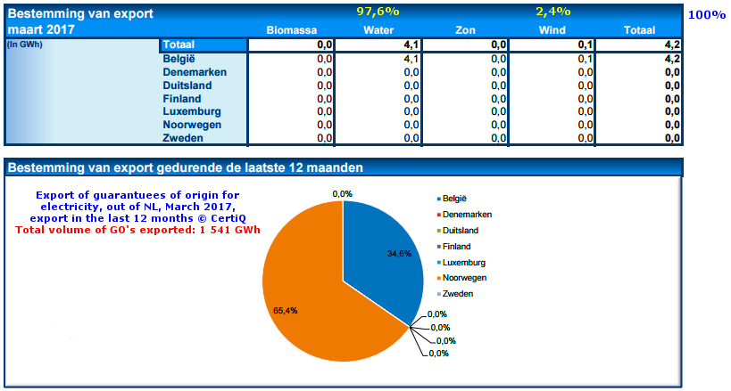 Er werd in maart vrijwel "niets" aan GvO's Nederland uit ge-exporteerd, slechts 4,2 GWh (was in februari nog 188,6 GWh!). Ditmaal mocht België (langdurig de tweede recipiënt van door NL leveranciers doorverkochte exemplaren) het microscopische beetje aan groene papierwaren bekomen. Het land wisselt al lang stuivertje met Noorwegen op dit punt. De ratio export / import van GvO's is in maart 2017 gedaald naar een zeer laag percentage van minder dan 0,1%. Dat was in februari nog 4,4%, in januari 6,5%. In december 2016 4,1%, in november 9,2%, en in oktober 4,3%.