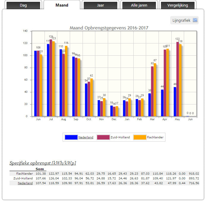 De bovenste tabel geeft de maand productie in maart 2017 weer, voor alle deel systemen (met eigen kleur codes). Sommige weergegeven data zijn "verzamelingen" ("6x 108 Wp" bevat de deelsystemen "2x 108 Wp ZZO voor" en "4x 108 Wp ZZO achter"). In de laatste kolom zijn de Wh producties terug gerekend naar de aanwezige capaciteit in de deel-groepen, en krijgen we dus de "specifieke productie". Die wordt uitgedrukt in Wh/Wp, kWh/kWp, MWh/MWp, etc., over een gespecificeerde periode (in bovenste tabel: maart 2017).