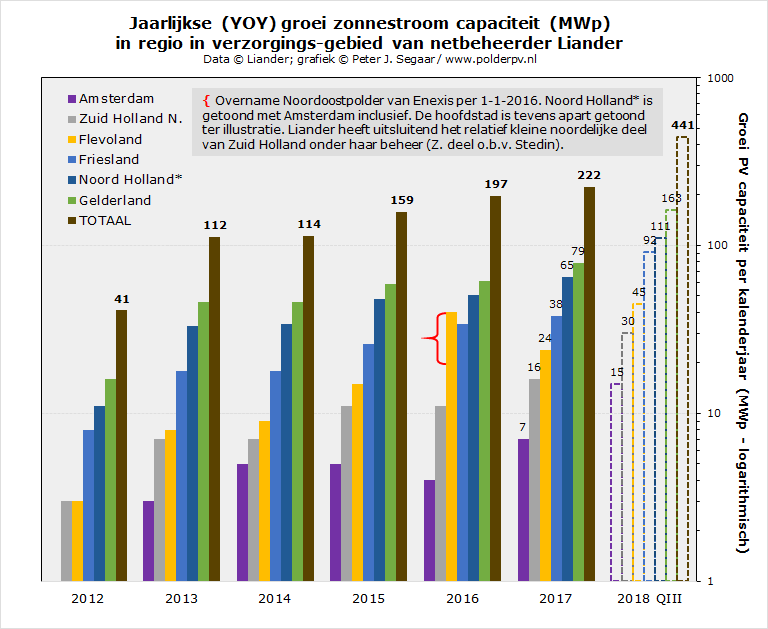 In deze derde grafiek geef ik u de uit de accumulatie cijfers van Liander te halen jaargroei cijfers voor de afzonderlijke gebieden in grafiekvorm. Zie ook de eerste grafiek in dit artikel (accumulaties per kwartaal). De grafiek is met logarithmische Y-as weergegeven om ook de totalen te kunnen laten zien voor het hele netgebied van Liander (bruine kolommen). Voor de groei van de volumes in de eerste drie kwartalen van 2018 zijn de kolommen ongevuld en met gestreepte periferie weergegeven: de nog onbekende volumes in het laatste kwartaal van dit jaar moeten daar straks nog bij worden opgeteld.