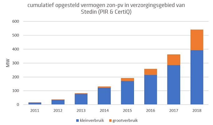 8 januari 2019: (Voorlopige) jaargroei cijfers netbeheerder Stedin 2018. Actief twitteraar Henri Bontenbal, werkzaam bij netbeheerder Stedin, lijkt 1 van de eerste te zijn bij de netbeheerders in Nederland, die zonnestroom capaciteit groei data voor het volledige kalenderjaar 2018 heeft gepubliceerd. In eerste instantie als een plaatje op Twitter, waarbij zowel de kleinverbruik (KVB) als grootverbruik (GVB) segmenten zijn weergegeven. Dit is een aanvulling op de situatie ontleend aan een status update voor alleen het KVB register van deze netbeheerder (10 okt. 2018, analyse Polder PV), en de in dat artikel genoemde eerdere updates van volledige overzichten voor deze netbeheerder.