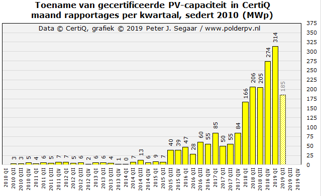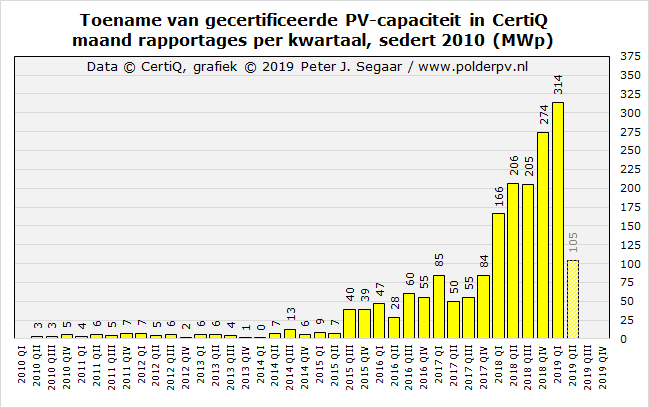 Het eerste kwartaal van 2019 liet een nieuw meld record bij CertiQ zien, 314 MWp. Het ligt in de lijn der verwachting dat dat kwartaal record later dit jaar mogelijk al gebroken kan gaan worden, vooral als in het betreffende kwartaal meerdere grote zonneparken zullen worden opgeleverd. Waarvan er vele in bouw zijn of die op het punt staan van daadwerkelijke uitvoering.