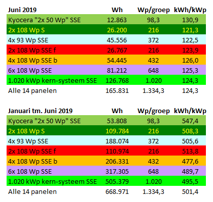 Bij de cumulatieve cijfers voor het eerste halve jaar van 2019 (onderste staatje) zijn de verhoudingen duidelijk anders: Hier presteert de deels in de wintermaanden beschaduwde, en de laatste jaren sowieso wat minder goede resultaten gevende 4x 108 Wp groep in de achterste rij het minst, bijna 478 kWh/kWp. De Kyocera panelen doen het met ruim 547 kWh/kWp bijna 15% beter. Alle 14 panelen bij elkaar hadden een specifieke opbrengst van ruim 501 kWh/kWp in de eerste 6 maanden van 2019. Opvallend blijft hierbij, dat onze oudste 4 stuks 93 Wp panelen (ruim 19 jaar oud!) het wederom zelfs iets beter doen dan het gemiddelde van alle panelen bij elkaar: bijna 506 kWh/kWp ...