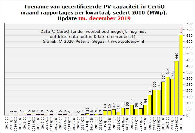 Eind december 2019 bereikte de zonnestroom databank van CertiQ een geaccumuleerde gecertificeerde capaciteit van 3.225,3 MWp. Het bereiken van de eerste "gecertificeerde" GWp kostte sinds eind 2009, toen er nog slechts 22 MWp PV capaciteit bij CertiQ bekend was (gecertificeerd), 8 een een half jaar. De tweede GWp heeft minder dan een jaar gekost. De derde GWp is al binnen een periode van 6 maanden toegevoegd (tussen mei en november 2019). Het is een van de belangrijkste redenen, waarom de netbeheerders op talloze plekken in ons land in de problemen zijn gekomen met de beschikbare netcapaciteit: ze zijn compleet overvallen door het enorme tempo van de nieuwbouw van met name de grote PV projecten.