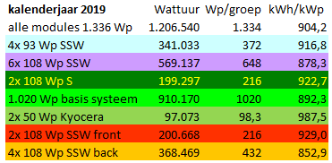 De achterste vier, in de winter partieel beschaduwde 108 Wp panelen (oranje band) blijven de zwakste schakel in het systeem, met een fors tegenvallende 853 kWh/kWp.jaar in 2019. De vier oudste, in de voorste rij staande panelen (4x 93 SSE, lichtblauw, netkoppeling 13 maart 2000, dus eind 2019 al 7.232 dagen "draaiend") blijven zonder meer zeer goed presteren (917 kWh/kWp.jaar in 2018; 4,8% boven "nieuwe norm" !). Op 12 oktober 2001 was het "kern" systeem, de 1,02 kWp installatie met 10 panelen (felgroene band), up and running, en heeft eind 2019, 6.654 dagen later, ook een bovenmatige prestatie laten zien, 892 kWh/kWp.jr in 2019 (1,9% boven "nieuwe norm").