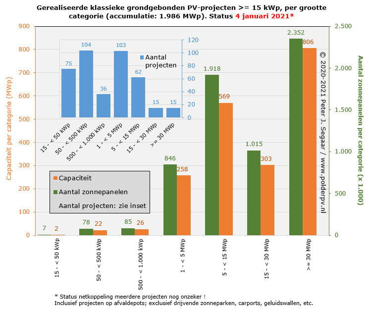 * Dit artikel is - dit overkomt me helaas vaker, vanwege regelmatig ontdekte fouten in officiële publicaties - herschreven vlak vóór publicatie. Op 14 januari werd namelijk een eerste grafiek gepubliceerd, waarin voor Flevoland voor eind 2020 een negatieve groei van 18 MW werd getoond t.o.v. de accumulatie eind Q3 2020 (zie screendump van die oorspronkelijke grafiek). Toen ik Liander hierover een vraag stelde kreeg ik als antwoord "dat er een foutje zou zijn gemaakt, en dat de data wordt/is gecorrigeerd". Dezelfde dag nog verscheen een nieuwe grafiek op de website van Alliander. Met niet alleen gewijzigde data voor Flevoland (met gelukkig nu - zoals al viel te verwachten - positieve groei van de accumulatie in Q4 2020). Maar óók weer gewijzigde cijfers voor alle andere regio (behalve de restcategorie "overig"). Die gewijzigde data zijn in het huidige artikel gebruikt, en ook zijn de door Polder PV gemaakte grafieken weer aangepast ... Conclusie. Solarstatistieken in Nederland: "never a dull moment" ...