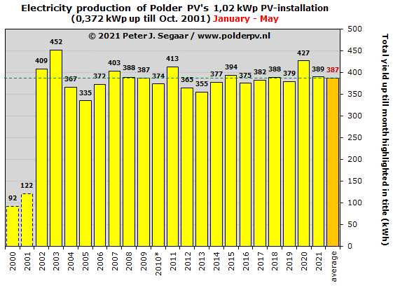 Achteraan het nog premature eerste resultaat voor het eerste half jaar van 2021, met de accumulatie voor januari tm. april, 735 MWp, als gearceerde kolom. Dit is al 58% meer t.o.v. het totale volume in het eerste half-jaar van 2020 (465 MWp), al moet daar wel aan toegevoegd worden dat in dat laatste cijfer ook de "negatieve groei anomalie in april 2020" zat besloten. Inmiddels is, met nog 2 maand rapporten te gaan, het oude record voor het eerste half-jaar, gevestigd in 2019, met 608 MWp, alweer met 21% overvleugeld. Dus met straks mei en juni erbij, gaat het een "spectaculair" eerste half-jaar worden. Met daarbij tevens de notie, dat het tweede half-jaar altijd (veel) hogere volumes heeft laten zien dan het eerste half-jaar (zie grafiek).