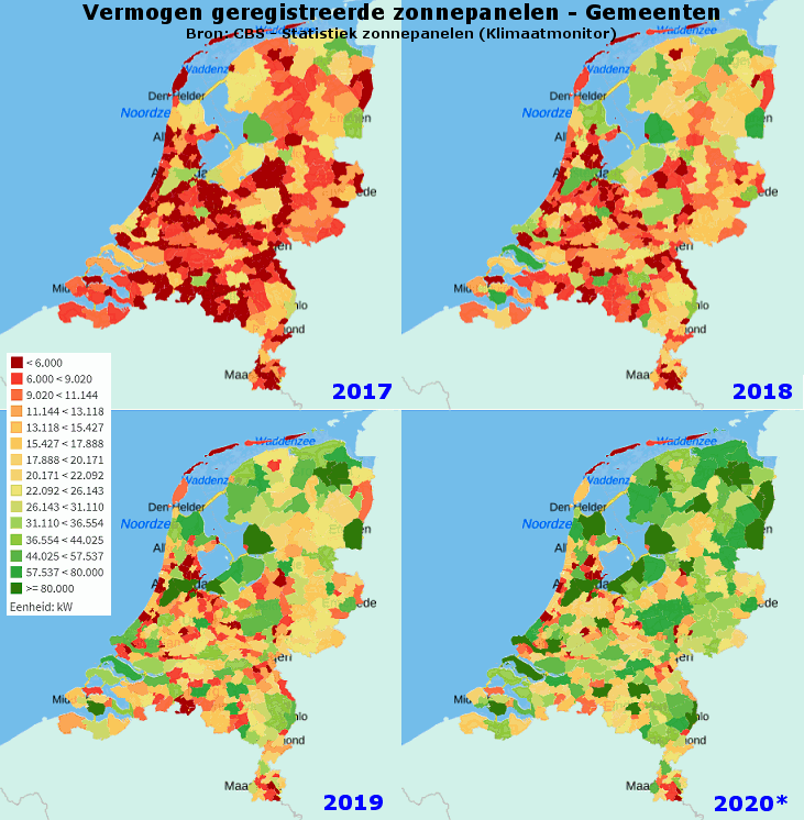 PV capaciteit per gemeente (in kWp), per deel-kaartje in 15 grootte klassen (zie legenda). Kaartjes / data © Centraal Bureau voor de Statistiek (CBS) via grafiek generator Klimaatmonitor, selecties en samenstelling Polder PV. Resultaten voor 2020 zijn "voorlopig", die voor eerdere jaargangen zijn "definitief".