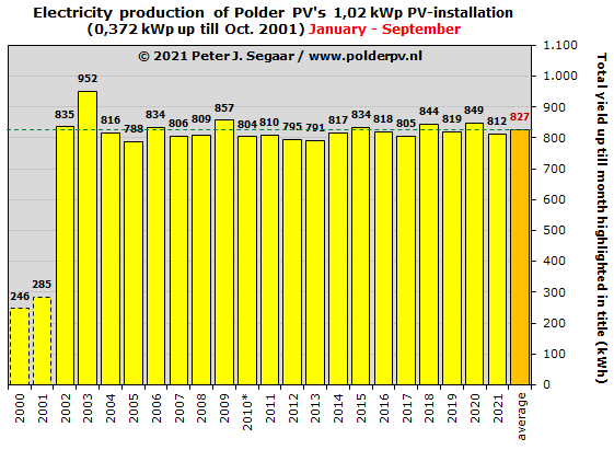 In deze al vele jaren bijgehouden maand grafiek zijn de resultaten voor september 2021 opgenomen, voor het 1,02 kWp kern systeem van Polder PV. 2021 is met een rode kleur weergegeven. September is licht ondergemiddeld uitgekomen voor deze langjarig producerende kern-installatie, 86,1 kWh, t.o.v. het langjarige gemiddelde van 86,9 kWh. In september 2020 was het iets bovengemiddeld, september van het "solar record jaar" 2003 was exceptioneel zonnig, met hoge productie tot gevolg (107,8 kWh). Producties vóór oktober 2001 zijn slechts van de eerste 4 panelen afkomstig, en niet representatief voor de output van het uit tien modules bestaande kern systeem. September - oktober 2010 was ook niet representatief omdat het complete systeem toen grotendeels was uitgeschakeld wegens een forse dakrenovatie. De producties in die niet representatieve maanden zijn niet opgenomen in de langjarige gemiddeldes.