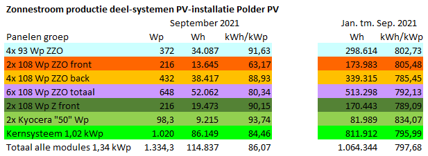 In de tabel is te zien dat september een iets ondergemiddelde productie liet zien, terug gerekend naar het generator vermogen binnen de onderscheiden deelgroepen tussen de 80 en 94 kWh/kWp in die maand. Opvallend is de lage specifieke productie van de 2 vooraan op het platte dak staande oude 108 Wp modules. Vermoedelijk is hier iets misgegaan in september, want het resultaat is laag. Gelukkig is dat nog niet goed terug te zien in de cumulatie in het rechter staatje (jan. tm. sep. 2021 805 kWh/kWp), maar het is wel iets om in de gaten te houden.