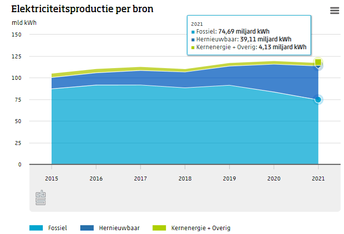 30% van de verbruikte elektriciteit zou in januari 2022 uit hernieuwbare bronnen komen, in januari 2021 was dat nog 26%. Het ambitieuze streefdoel voor 2030 is ... 70%, waarbij het Planbureau voor de Leefomgeving inschat dat het zelfs nog hoger zou kunnen gaan worden (75%). Stroomverbruik is echter maar een vijfde deel van het totale finale energie verbruik in Nederland (dominant warmte, 55%, transport neemt een kwart aandeel).