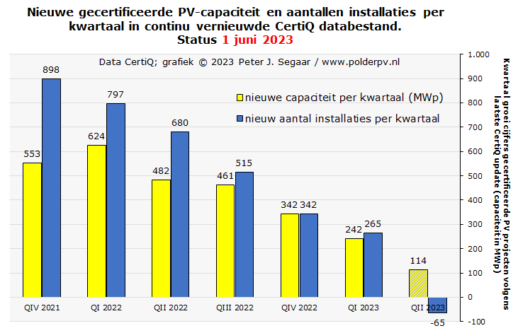 Ook al moet ook bij deze grafiek de waarschuwing, dat de cijfers nog lang niet zijn uitgekristalliseerd, en we nog de nodige bijstellingen kunnen verwachten, de trend bij de nieuwe aantallen projecten door VertiCer, en rechtsvoorganger CertiQ, geregistreerd van maand tot maand, in de huidige versie van juni 2023, laten een zeer duidelijke afkoeling van de PV-projectenmarkt zien sedert de zomer van 2021. Werden er in januari 2022 nog netto 384 nieuwe gecertificeerde PV-projecten bijgeschreven, is dat in de rest van het jaar al zeer duidelijk minder geworden, en vanaf augustus zelfs zeer sterk "afgekoeld". Met wat ups en downs, is het laagste volume voorlopig bereikt in november 2022, met, inmiddels, 74 nieuwe installaties. Daarna veerde het weer even op, daalde stapsgewijs, en bereikte in juni 2023 zelfs een licht negatieve groei van -34 projecten in deze update. Eerder getoonde negatieve groeicijfers voor de maanden maart tm. mei zijn inmiddels omgezet in positieve aanwas, a.g.v. de voortdurend wijzigende historische cijfers in de VertiCer bestanden.