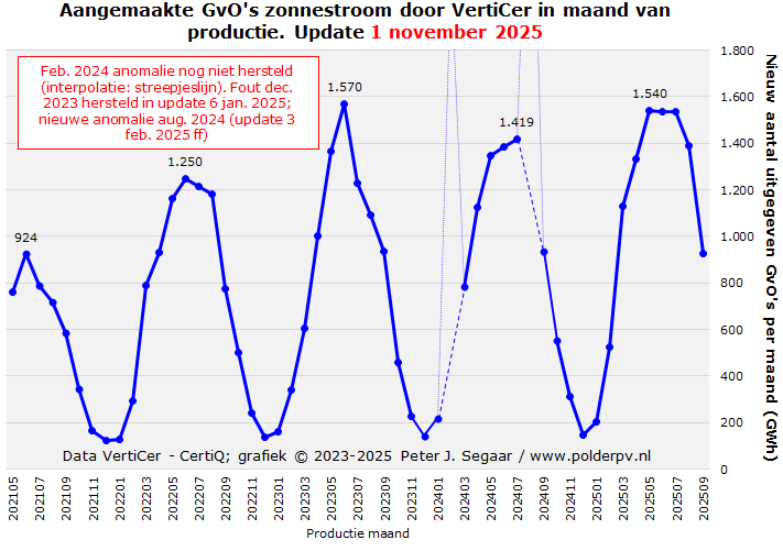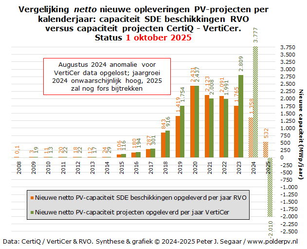 Normaliter liggen de cijfers bij VertiCer wel altijd (ver) voor op het RVO - SDE dossier. Feit blijft, dat sowieso bij RVO talloze reeds netgekoppelde projecten nog niet met een "ja" vinkje zijn gezegend in de publiek beschikbare data overzichten. Die dus nog niet in hun (actuele) cijfers kunnen zitten. Die projecten staan al lang in de VertiCer databank, omdat er al meteen garanties van oorsprong aangemaakt moeten gaan worden, "zodra de stekker in het betreffende project gaat". Voor de meeste projecten achter grootverbruik aansluitingen worden maandelijks (automatisch) meetgegevens via de meet-gemachtigde ingediend, die direct naar VertiCer worden doorgesluisd na validatie door de betreffende netbeheerder. Registratie bij VertiCer gebeurt in het grootste deel van de gevallen zeer rap na fysieke netkoppeling. Dagelijks worden updates gedraaid met de nieuwste toevoegingen die door de exploitanten worden doorgegeven, en waarvoor de netbeheerders hun formele fiat hebben gegeven (pers. comm. Polder PV met medewerker van VertiCer rechtsvoorganger CertiQ, in 2022). Wat daarna geschiedt in het RVO traject kan echter vele maanden kosten, voordat dit leidt tot een "formeel ja vinkje" in hún databestand. Ik kom soms nieuwe "ja" vinkjes tegen van projecten die vroeg in 2024, of zelfs in de 2 voorgaande jaren netgekoppeld zijn opgeleverd, dus die vertraging kan bij sommige projecten zeer fors oplopen. Het is een van diverse redenen, waarom de nationale statistiek cijfers zo "vloeibaar" zijn, en regelmatig wijzigen.