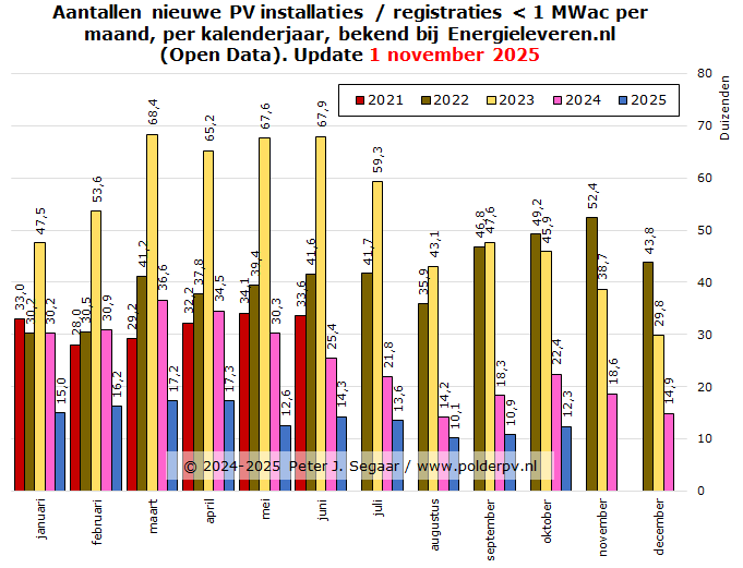 Met de toevoeging in oktober zijn er begin november 2025 in totaal nu bijna 3,27 miljoen PV installaties per stuk < 1 MWac bekend bij energieleveren.nl, volgens de optelling van de drie grootte-categorieën. Hierbij nogmaals de bekende disclaimer: dat is niet het aantal woningen, of dergelijke claims. Er worden immers zeer regelmatig uitbreidingen (= "installaties") aan bestaande projecten toegevoegd, zowel residentieel, als in de projecten markt, een endemisch verschijnsel in Nederland. Het aantal "objecten", "erven", "project sites", is, derhalve, altijd (veel) lager, dan bovengenoemd getal. Wat, desondanks, natuurlijk zonder meer een spectaculair volume blijft weergeven.