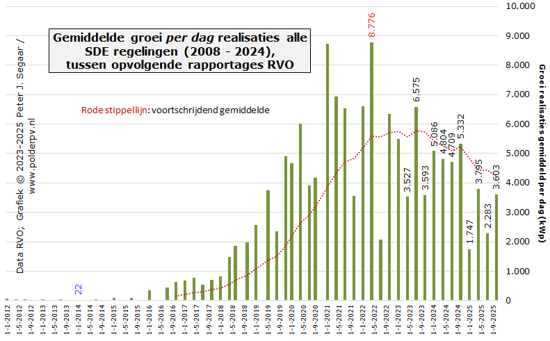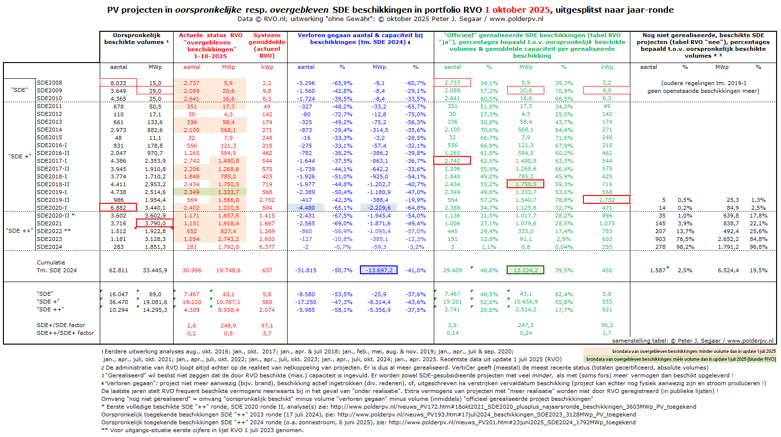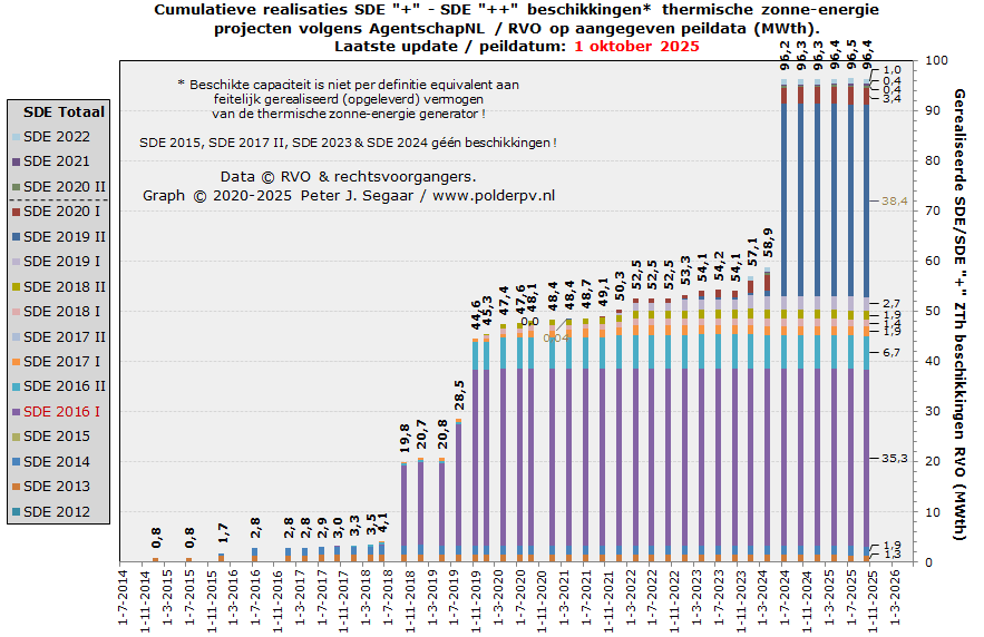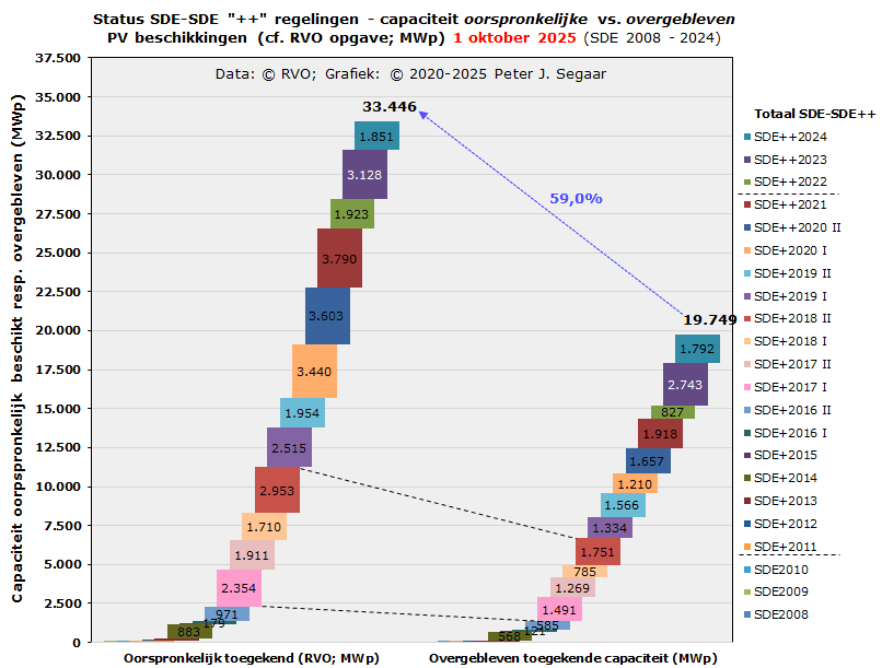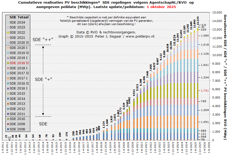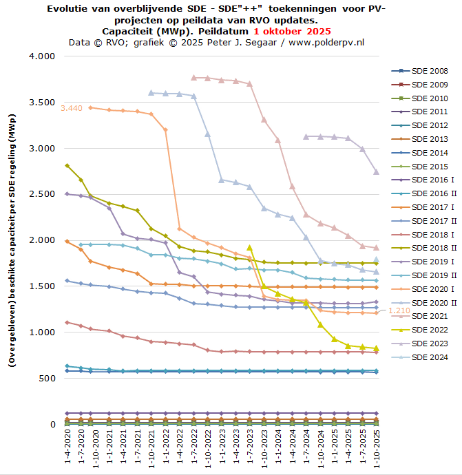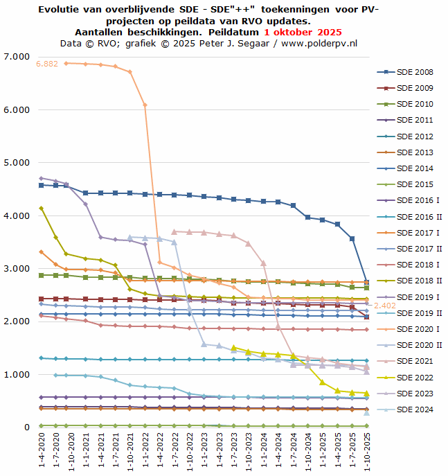 In de 1 oktober 2025 update waren er bij RVO voor SDE 2019 II tm. SDE 2024 nog 1.587 beschikkingen over, resp. 6.524 MWp door RVO toegekende capaciteit. In de update van 1 juli 2025 was dat, voor SDE 2019 II tm. SDE 2023, nog 5.365 MWp, in april 2025, vanaf SDE 2019 I, 5.869 MWp, in januari 2025, vanaf SDE 2017 I, 6.420 MWp, in oktober 2024 6.847 MWp, in juli 2024 8.047 MWp (incl. toen toegevoegde SDE 2023), in april 2024, nog zónder SDE 2023, 5.977 MWp, in januari 2024 7.072 MWp, in oktober 2023 7.973 MWp, juli 2023, met SDE 2022, 9,8 GWp, april 2023, nog zónder SDE 2022, 8,7 GWp, januari 2023 9,2 GWp, oktober 2022 10,4 GWp, juli 2022, mét SDE 2021 11,7 GWp, april 2022, nog zónder SDE 2021, 8,5 GWp, januari 2022 10,9 GWp, oktober 2021, incl. SDE 2020 II, 11,8 GWp, juli 2021, nog zónder SDE 2020 II, bijna 9,0 GWp, april 2021 9,8 GWp, januari 2021 10,9 GWp, sep. 2020, met SDE 2020 I toegevoegd, 12,1 GWp, juli 2020, nog zonder SDE 2020 I 9,4 GWp, apr. 2020, nog zonder SDE 2019 II 8,1 GWp, jan. 2020 nog 9,3 GWp, nov. 2019 10,1 GWp, aug. 2019, nog zonder SDE 2019 I, nog ruim 8,2 GWp.