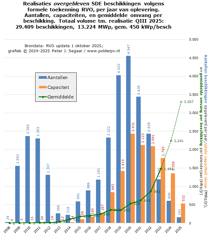 De SDE beschikkingen zijn wat aantallen (blauwe kolommen) betreft eerst explosief gestegen, en stapsgewijs afgenomen, vanaf 2008, met de max. in 2009 (nog maar 1.552 beschikkingen overgebleven gerealiseerd, alweer fors minder dan de 2.369 exemplaren in de update van 1 juli 2025). Dit waren bijna uitsluitend residentiële mini-projectjes, op enkele uitzonderingen na (zoals het met tientallen SDE 2009 beschikkingen "gezegende" Klepperstee veldinstallatie project, opgeleverd in het voorjaar van 2012). De "all-time low" werd bereikt in 2014, met, iets neerwaarts bijgesteld, slechts 218 nieuwe opleveringen dat jaar. Gelukkig was daar de zeer succesvolle SDE 2014, die voor nieuwe energie zorgde, en voor die tijd een record aantal toekenningen. Gaandeweg namen de volumes weer rap toe, uiteraard extra versneld door met name de enorme hoeveelheid beschikkingen voor de SDE 2016 en latere regelingen. De uiteindelijke max. kwam in Corona jaar 2020, met 4.547 opgeleverde, overgebleven beschikkingen dat jaar (2 minder overgebleven t.o.v. de vorige update). Daarna gingen de volumes rap omlaag, grotendeels vanwege landelijk optredende congestie op de netten. Het realisatie tempo nam flink af, om in 2023 haar voorlopige dieptepunt te bereiken, momenteel 1.190 nieuw opgeleverde beschikkingen, althans, volgens de RVO administratie.