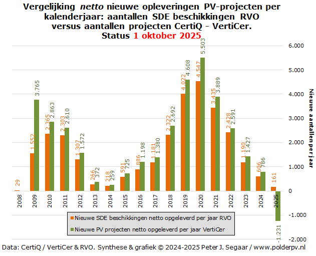 In dit diagram worden de uit de oudere CertiQ, en meer recente VertiCer updates ge-extraheerde aantallen nieuwe gecertificeerde PV-projecten per kalenderjaar (groene kolommen) vergeleken met de uit de vorige grafiek overgezette aantallen SDE beschikkingen die per jaar zouden zijn opgeleverd volgens de RVO administratie (oranje kolommen). Direct valt op, dat de aantallen bij de CertiQ/VertiCer data nu stelselmatig een stuk hoger liggen dan die voor de SDE beschikkingen bij RVO. De laatste liggen op niveaus tussen de 41% (2009) en 88% (2011), tot bijna 94% (2022) ten opzichte van die van VertiCer. In een eerdere update was de verhouding voor 2023 nog in het voordeel van de data van RVO, maar ook dat is het inmiddels, met de meeste recente data, in het voordeel van de cijfers van VertiCer omgeslagen, zoals in een voorgaande update al was voorspeld. Voor 2024 was de situatie ongeveer gelijk, maar met de meest recente cijfers is wederom het VertiCer dossier "leading" t.o.v. de huidige status bij de SDE realisaties bij RVO.