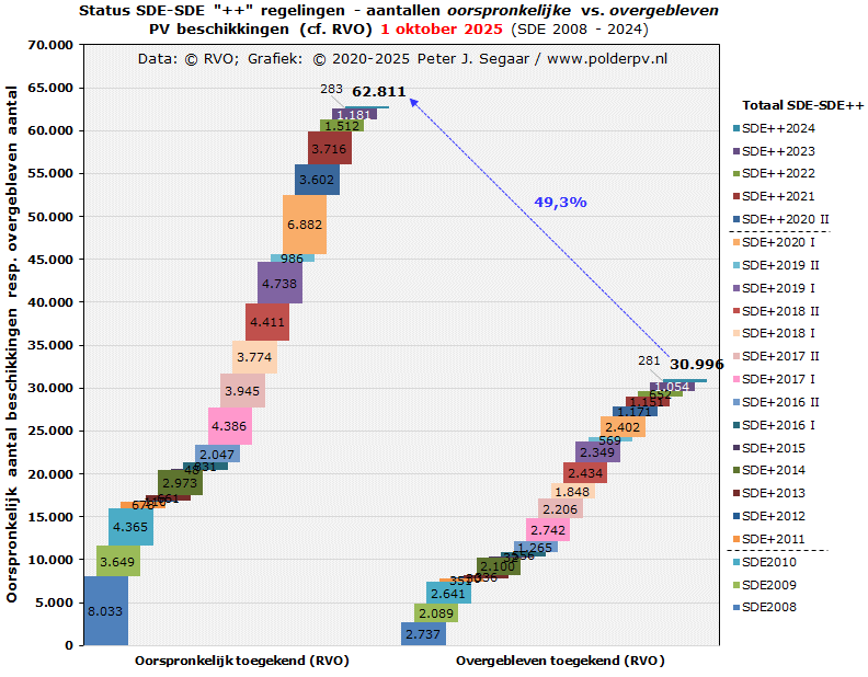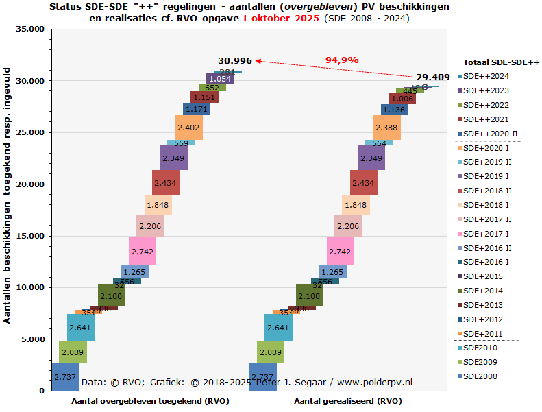 Stapelgrafiek met links de kolommen stapel met de overgebleven (!!) hoeveelheden beschikkingen van SDE 2008 tm. SDE "++" 2024 (laatstgenoemde in de huidige update bovenaan toegevoegd, azuurblauwe segment bovenaan). In combinatie met de voortgaande uitval bij de oudere SDE regelingen, zien we momenteel een cumulatie in de resterende, overgebleven hoeveelheid van 30.996 toekenningen voor zonnestroom (project beschikkingen, vorige update, nog zonder SDE 2024: 31.871 exx.). Dat waren bij de ooit oorspronkelijk vergeven exemplaren nog 62.811 beschikkingen (zie tabel en eerste grafiek onder a), waarvan dus al een aanzienlijk deel in de (digitale) papiershredder is verdwenen. De rechter stapel kolom geeft de in de update van 1 oktober 2025 door RVO formeel als "gerealiseerd" verklaarde hoeveelheden beschikkingen per regeling weer. Met als voorlopige cumulatie 29.409 beschikkingen gerealiseerd. Dat is wederom een lichte afname t.o.v. de voorgaande update (30.318 exx.), door een toegenomen aantal uitschrijvingen uit de RVO databank. Dit overgebleven volume is 94,9% van het overgebleven aantal "totaal overgebleven beschikt" (linker stapel) is. Weer een kleine afname t.o.v. de 95,1% in de vorige update.