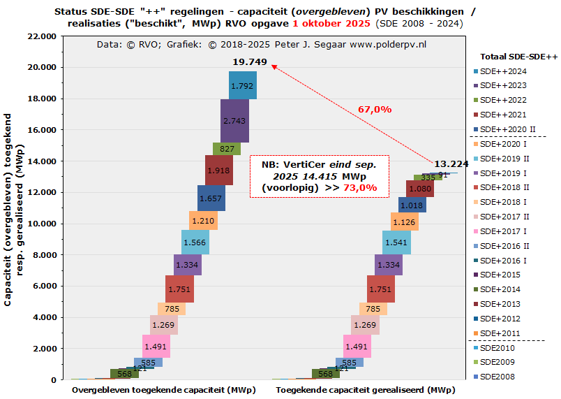 Het VertiCer (voorheen CertiQ) dossier, met fysiek gerealiseerde volumes, blijkt in hun laatste status updates, zoals te doen gebruikelijk, alweer een stuk verder te zijn, t.o.v. de gerealiseerde volumes beschikkingen van RVO, al hoort hier weer een forse waarschuwing bij. Bij VertiCer stond eind september 2025 namelijk alweer 14.415 MWp aan fysieke opleveringen, waarvan het allergrootste deel SDE beschikte projecten betreft (en nog een onbekend, hoogstwaarschijnlijk "zeer beperkt" deel zonder SDE beschikking). Dat volume is wat de realisaties betreft 9% groter dan het totaal aan beschikte capaciteit wat er eind QIII 2025 bij RVO nog over zou zijn voor de SDE projecten. Zouden we het reeds bereikte VertiCer volume afmeten aan het overgebleven beschikte totaal volume bij RVO, begin oktober 2025, zouden we al op een onwaarschijnlijke 73,0% realisatie komen, beduidend hoger dan de status bij RVO zelf (kader in grafiek). Met de voorbehouden die daar bij horen. Een zo'n voorbehoud is, dat het VertiCer volume waarschijnlijk veel te hoog ligt, doordat er nog zeker 2 forse anomalieën in de opgegeven capaciteit cijfers blijken te zitten. Derhalve, moet dat volume later flink neerwaarts worden bijgesteld. Hoeveel, dat is nog de grote vraag.