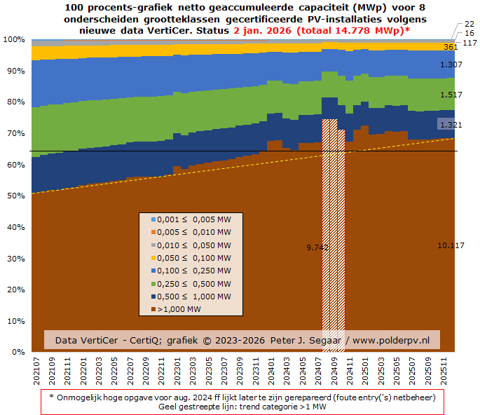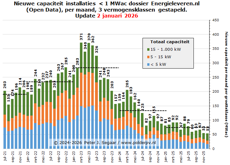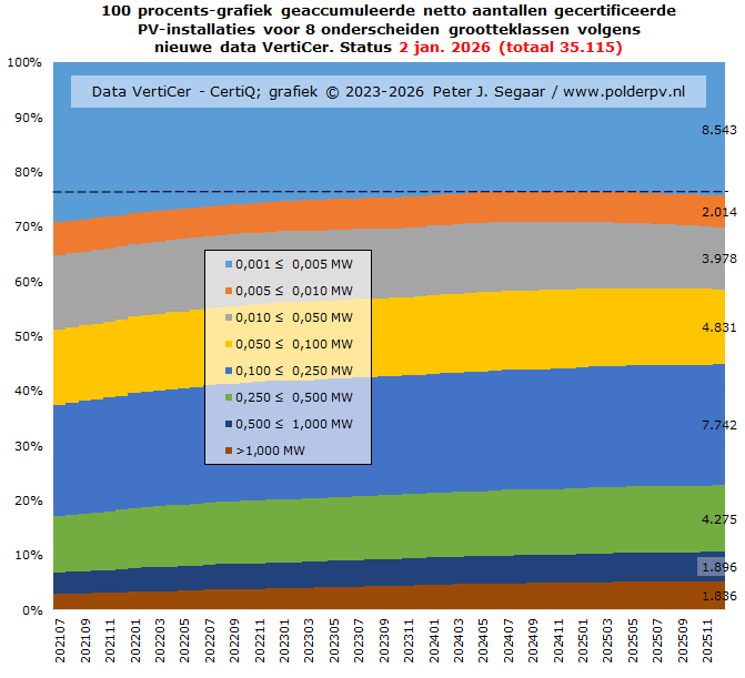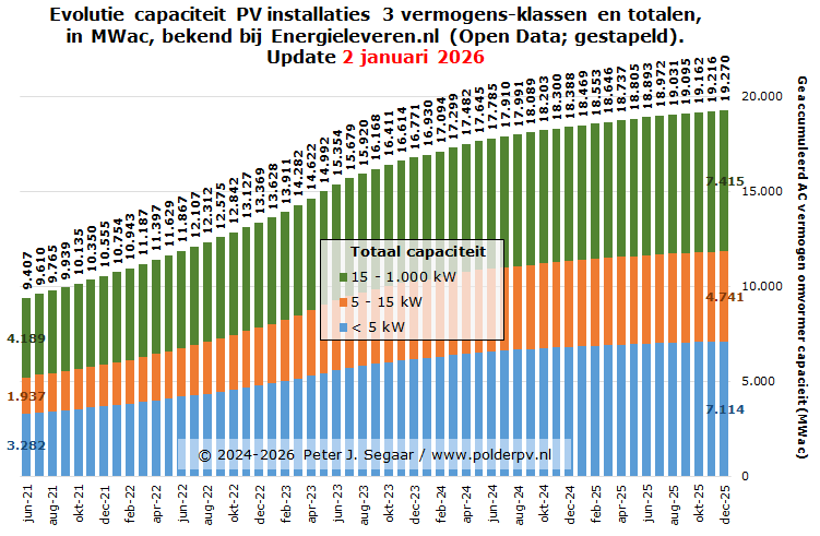 In de september 2024 rapportage werd het passeren van de piketpaal 18 GWac gemeld, en eind augustus 2025 de 19 GWac grens, in alleen het sub 1 MWac segment. Eind december dit jaar staat nu een totaal volume van 19.270 MWac vermogen geaccumuleerd. 37% daarvan, een enorm volume van ruim 7,1 GWac, is bijna exclusief residentieel (installaties kleiner dan 5 kWac, blauwe segmenten in de grafiek). Daarbovenop komt nog een deel van de op 1 na grootste categorie, installaties tussen de 5 en 15 kWac, die eind 2025 in totaal nog eens ruim 4,7 GWac omvatte.