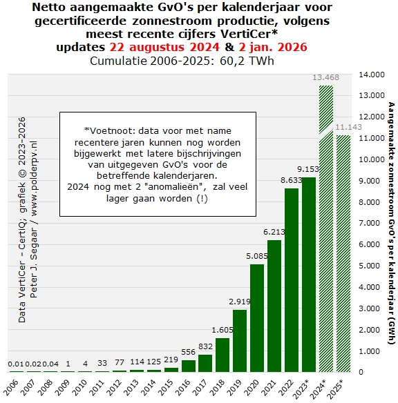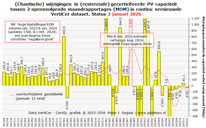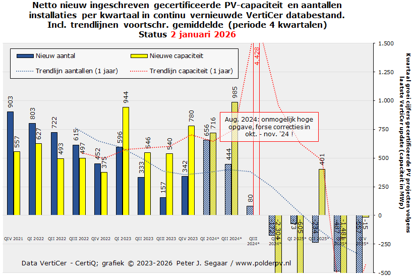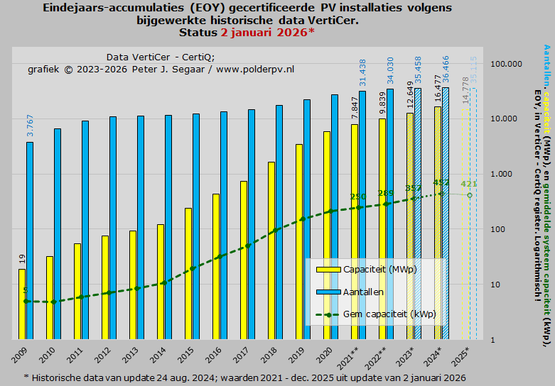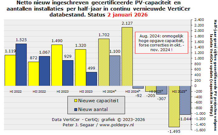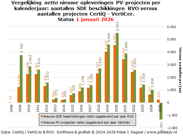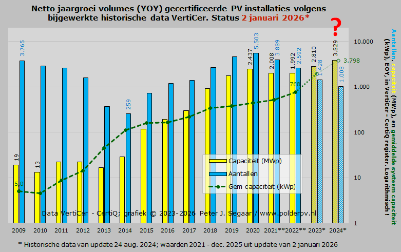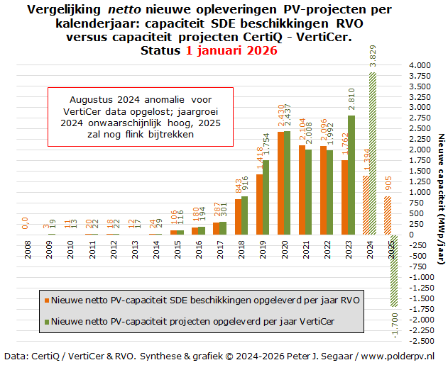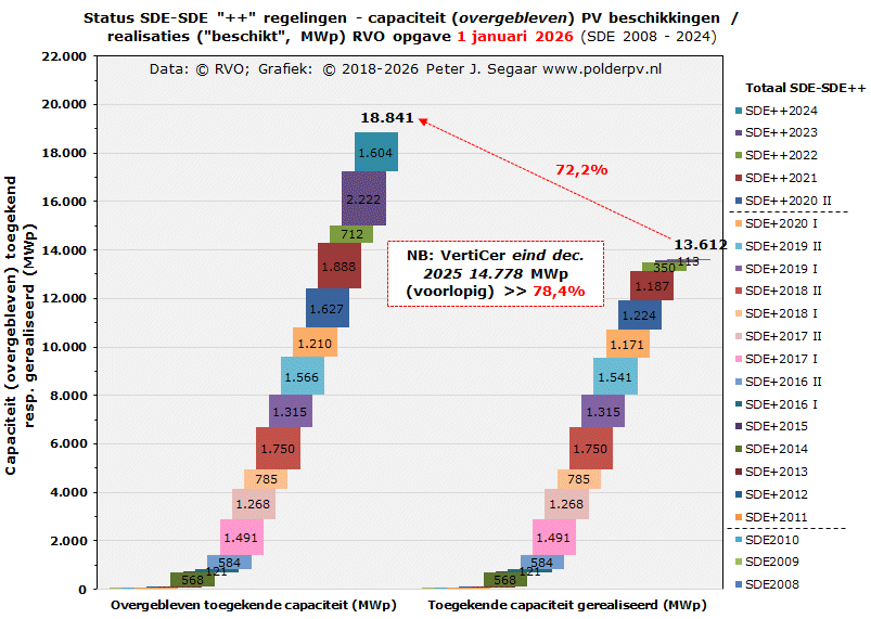De nieuwe realisaties en de tussentijdse uitschrijvingen leidden, in cumulatie, begin 2026, tot een volume van 13.613 MWp aan (SDE) beschikt gerealiseerd PV vermogen, verdeeld over inmiddels 29.021 gerealiseerde (overgebleven) aanvragen. Door verliezen / uitschrijvingen van veelal oudere gerealiseerde projecten, is dat aantal weer lager dan in de vorige update, en zal de ooit behaalde status van meer dan 30.000 exemplaren (tm. rapportage 1 juli 2025) vermoedelijk nooit meer bereikt gaan worden onder de SDE regimes. De netto realisatie van 388 MWp beschikt vermogen in het laatste kwartaal van 2025, is ruim 17% hoger dan de 331 MWp toename in QIII 2025. Gerekend naar het door RVO gemelde jaar van oplevering van de afzonderlijke beschikkingen, zou er een voorlopige toename van 1.762 MWp aan beschikte capaciteit zijn geweest in 2023, momenteel 16% minder dan de huidig vastgestelde aanwas in 2022 (2.096 MWp). De jaargroei in 2024, momenteel 1.394 MWp, 21% minder dan de huidig bekende jaargroei in 2023, is weliswaar nog steeds zeer voorlopig maar de verwachting is, dat deze cijfers niet "zeer substantieel" zullen gaan wijzigen. Wat, wederom, de al langer door Polder PV sterk betwijfelde data van VertiCer, met véél hogere capaciteits-volumes voor de jaren 2023 en 2024, in een extra kritisch daglicht stelt.
